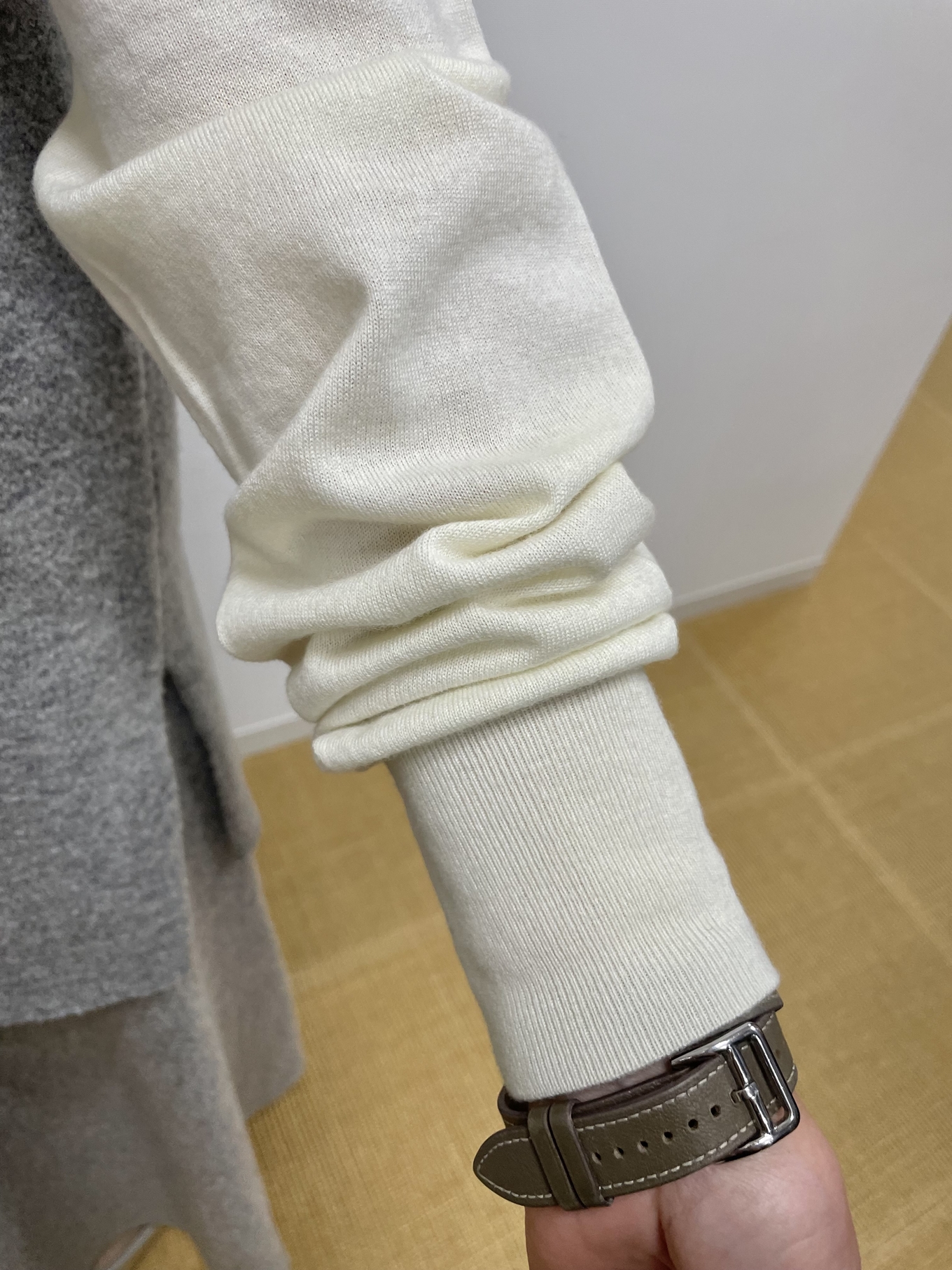 「カシミヤに匹敵する繊維長の特別な原料を、イタリアの特殊紡績技術で梳毛と紡毛の中間のようなタッチに仕上げた糸を使っています。薄手ウールニットでありながらカシミアのような肌触りで、驚くほど軽くてあたたかいんです。インナーにも、1枚着でもサマになるサイズ感で、春先まで欠かせないアイテムです」