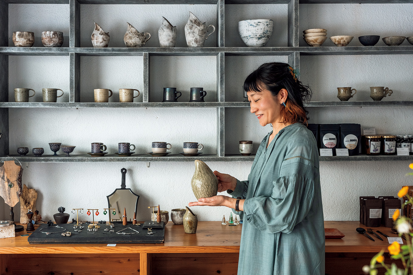 夫の藤田俊次さんがバイヤー、妻の日菜子さんが豊富な知識で店頭に立つ器のセレクトショップ。手に持っているのは、岩田智子さんの灰釉のピッチャー。器の説明をする日菜子さんの言葉には、作家への愛がひしひしと。