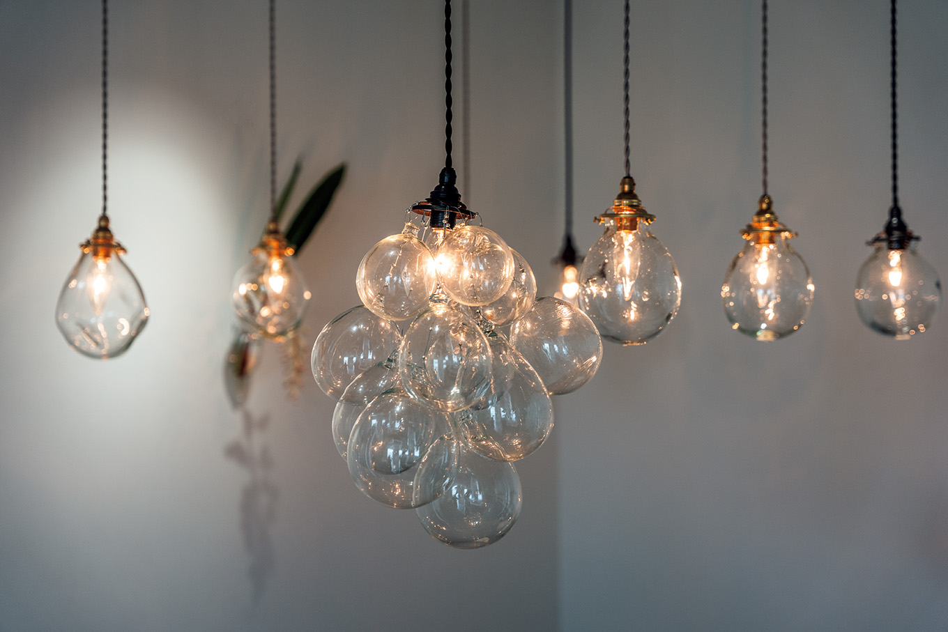 吹き、成形、仕上げまで、ひとりで製作するガラス作家おおやぶみよさんのギャラリーショップ。中央はガラスと真鍮ブロンズ仕上げのライト、Memory(ブロンズタイプ)157,300円、その他は38,500円〜。