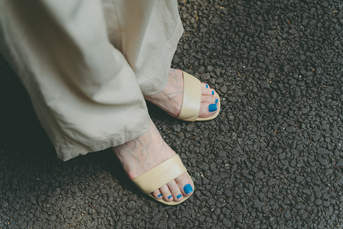 この夏は青がマイブームだという國枝愛美子さん。『H&M』のトップスに、リネン素材のパンツ、サンダルを合わせた夏らしいコーディネート。