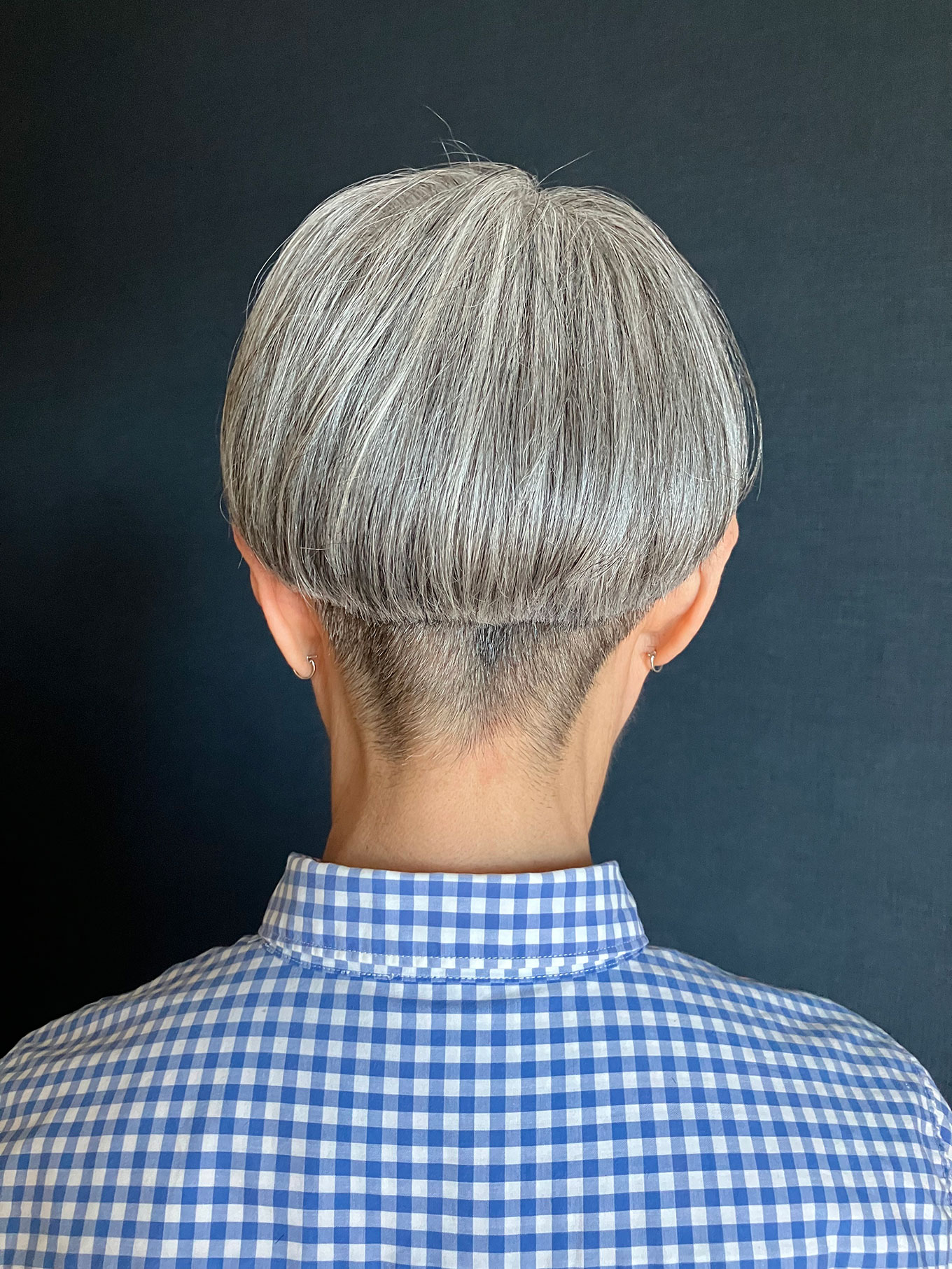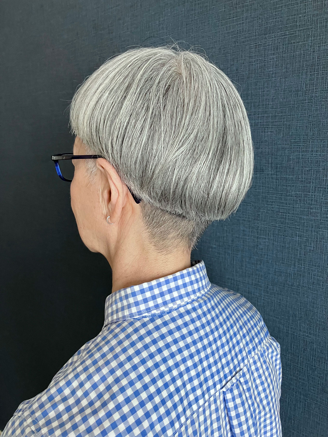 すでに髪はショートスタイルでしたので、自分で少しずつグレーヘアに移行させようと、頭頂部だけ3段ほど明るいカラーを入れて。6〜7か月を過ぎると、髪色は自然に全体がグレーになりました。