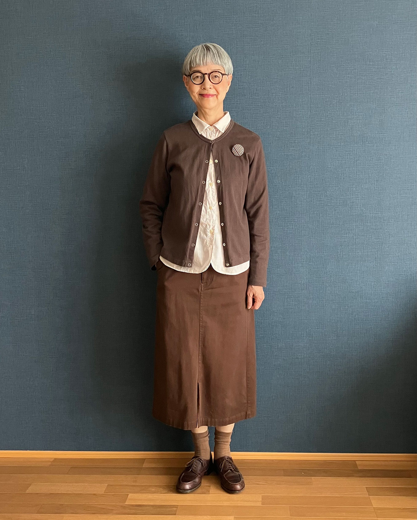 ミノムシのように全身茶系ですが、同系色のブラウスと自作のブローチをポイントにしています。茶系でもチョコレート色のような、こんなミノムシ色のコーディネートにはグレーヘアもしっくりなじみます。
