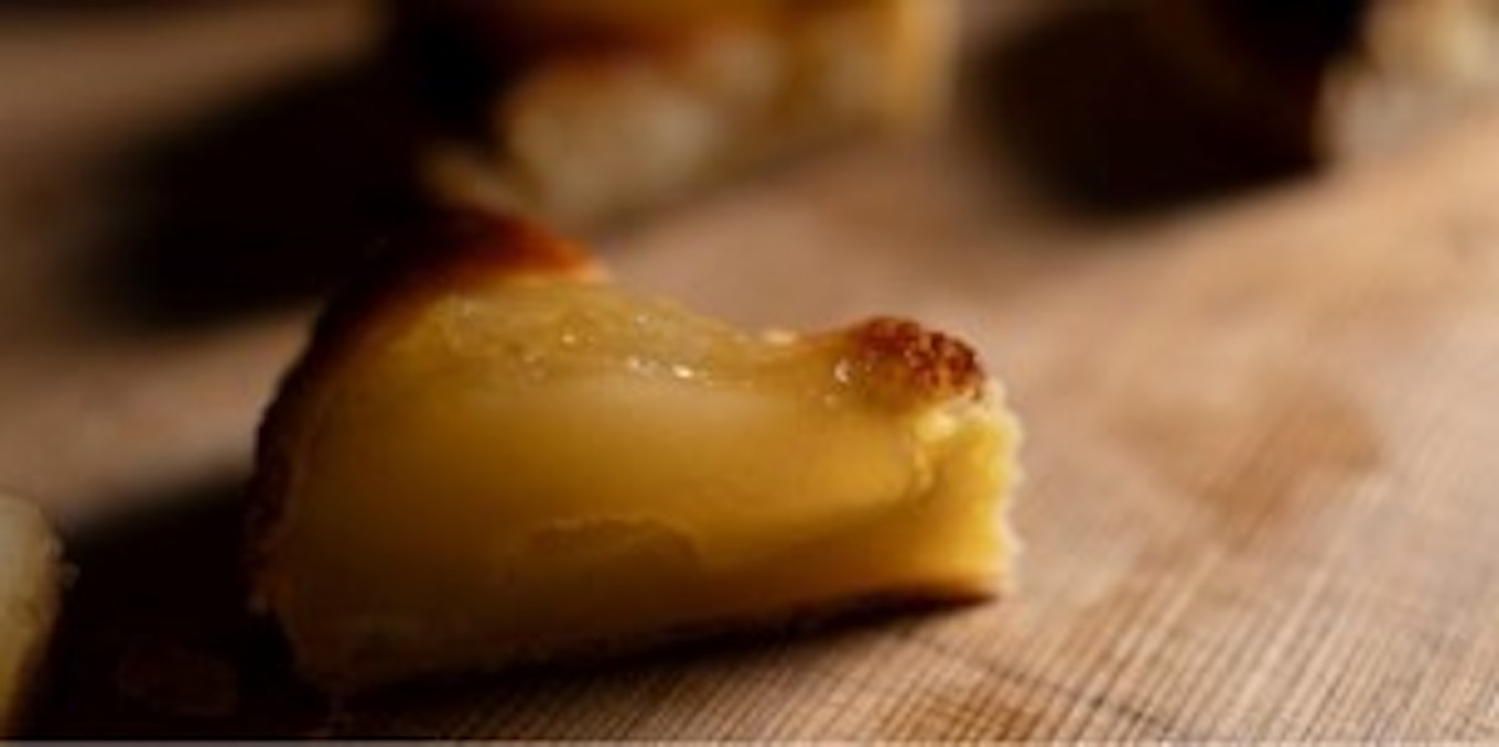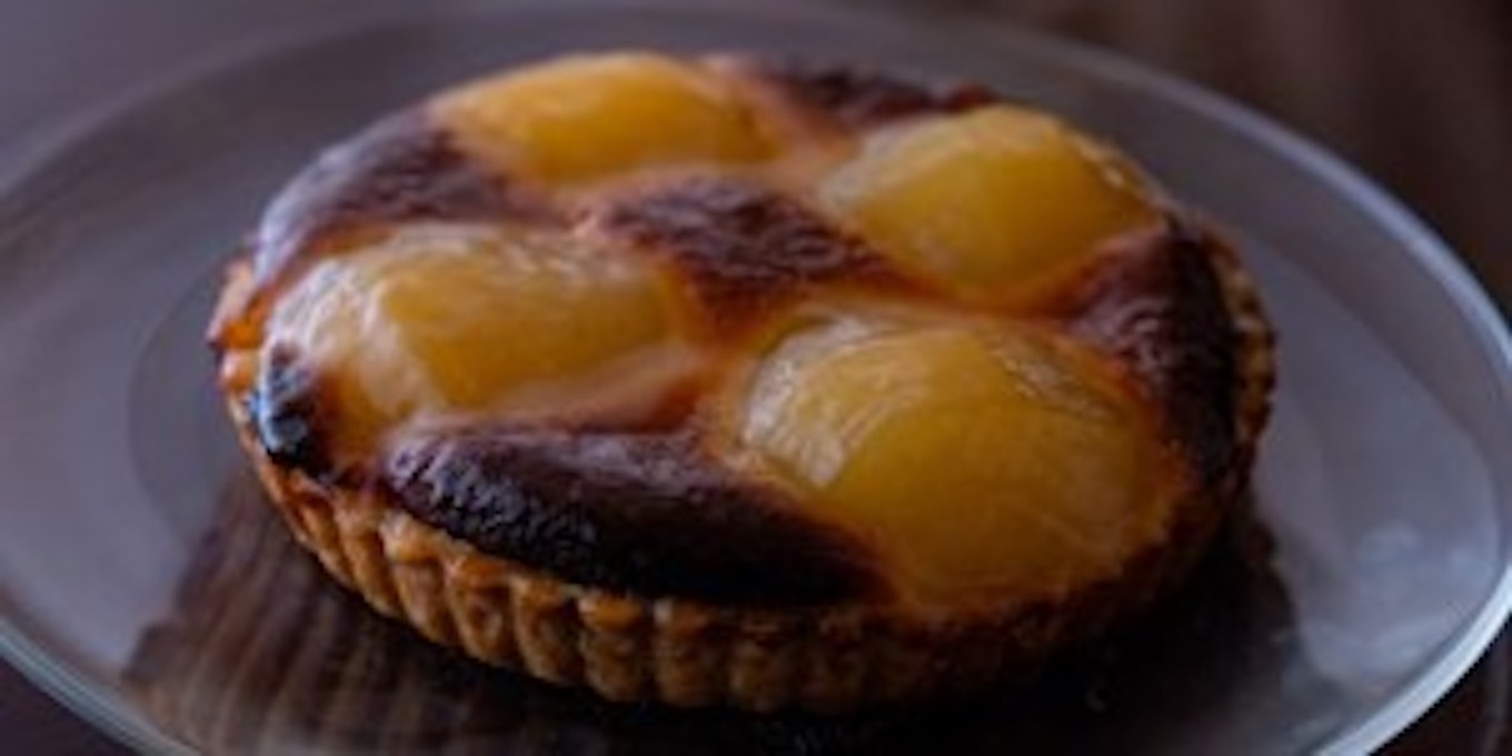 タルトにのっているのは、山形県の『川口観光果樹園』の有機栽培ラ・フランス。アーモンドと卵をたっぷり使ったタルト台に、追熟させたラ・フランスを生のままのせて焼き込むことで、香りと果汁がじゅわっと染み込んだタルトに仕上がっています。