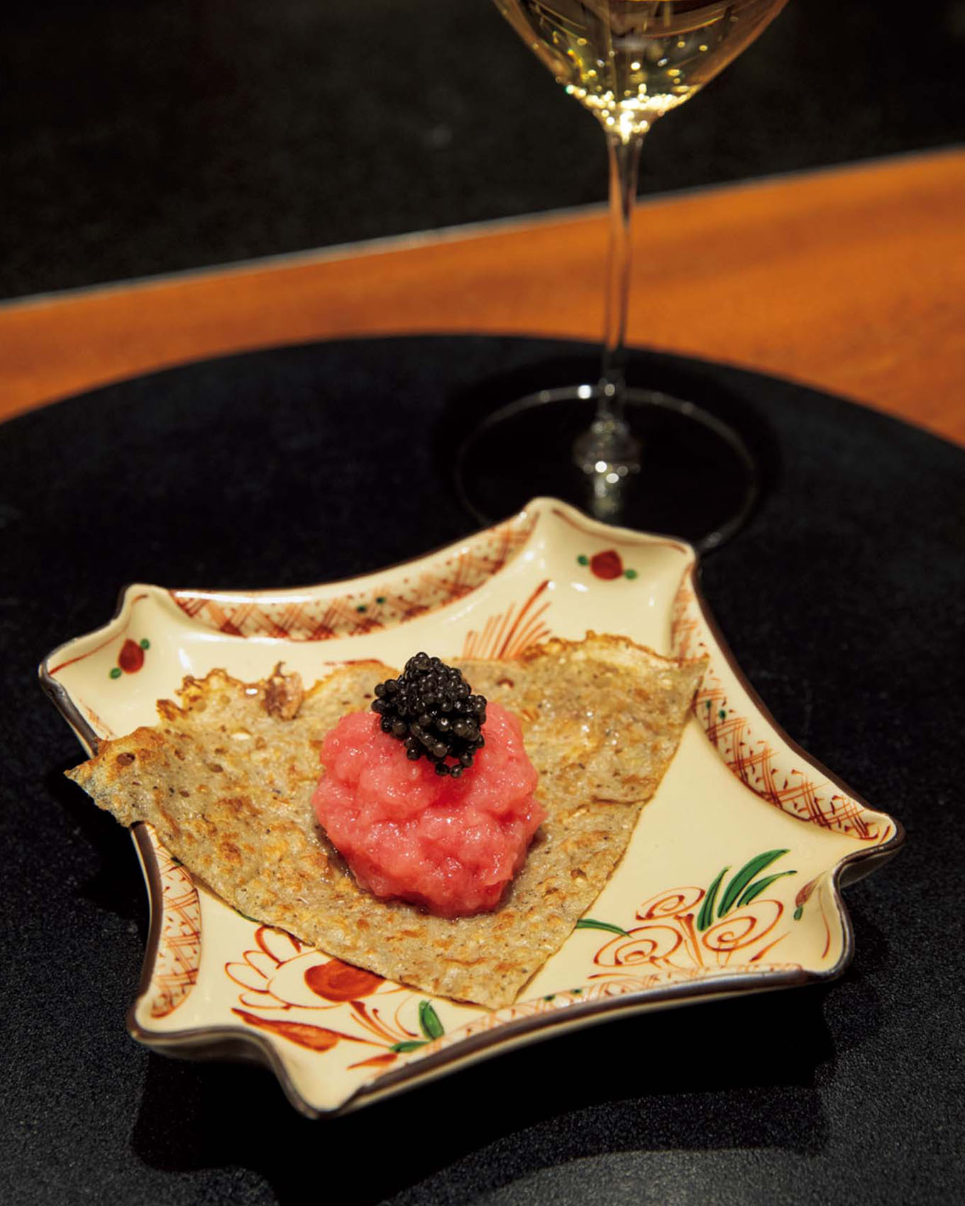 蕎麦粉ガレットにはマグロのかき身とキャビアが。隠し味にわさび。