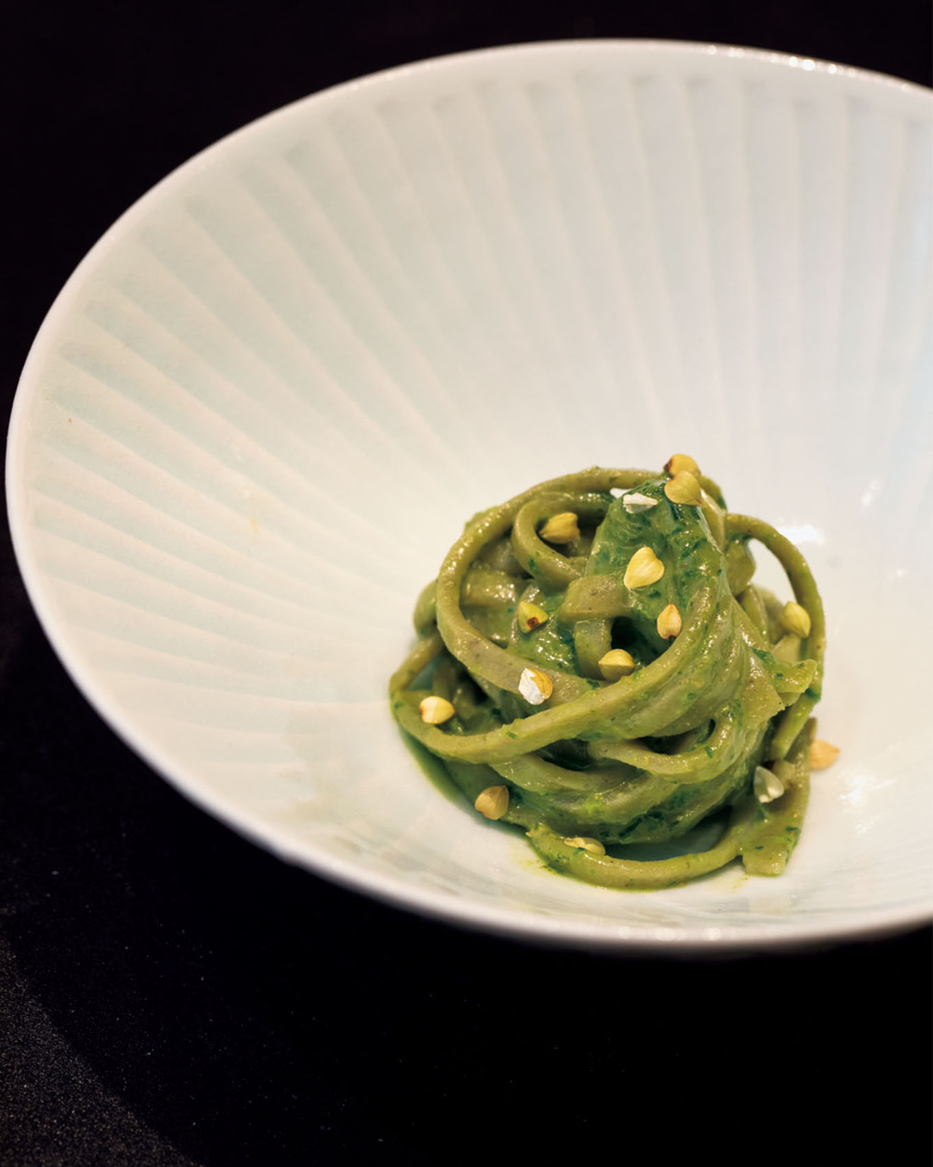 蕎麦のジェノベーゼはこしあぶらがソースに。蕎麦の実がアクセント。
