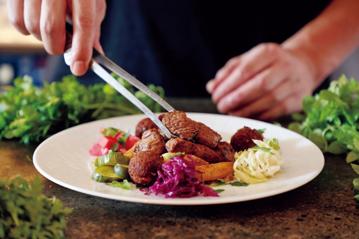 フレンチシェフが手がけるレバノン料理は、洗練されたオリジナル。ひよこ豆のコロッケの「ファラフェル」と、「メゼ」と呼ばれる色とりどりのお惣菜を、野菜の炭を練り込んだ黒いピタパンに詰めていただくスタイルは、なんとも異国情緒を感じさせます。