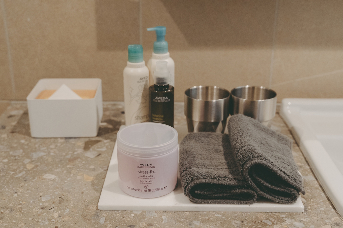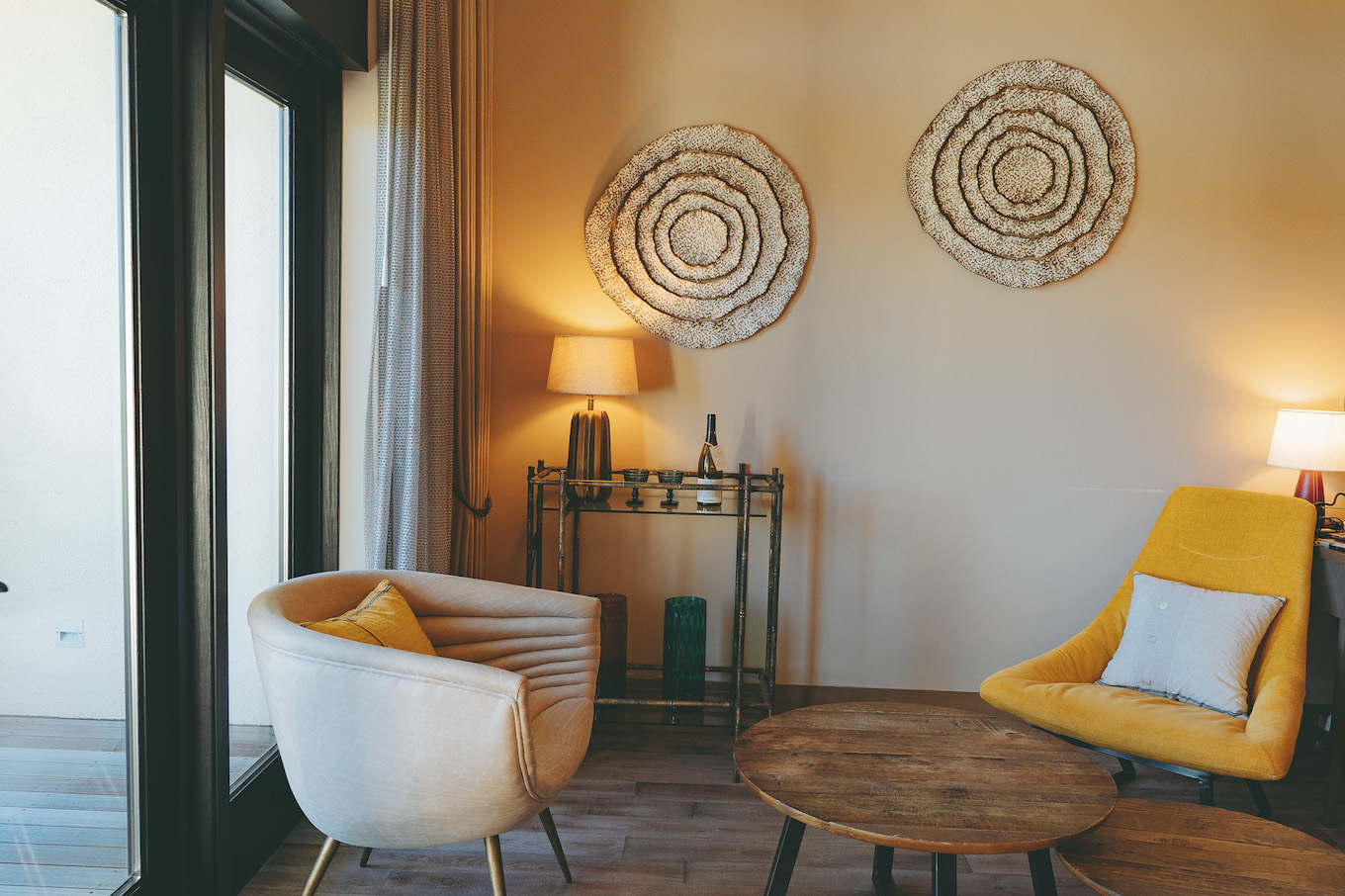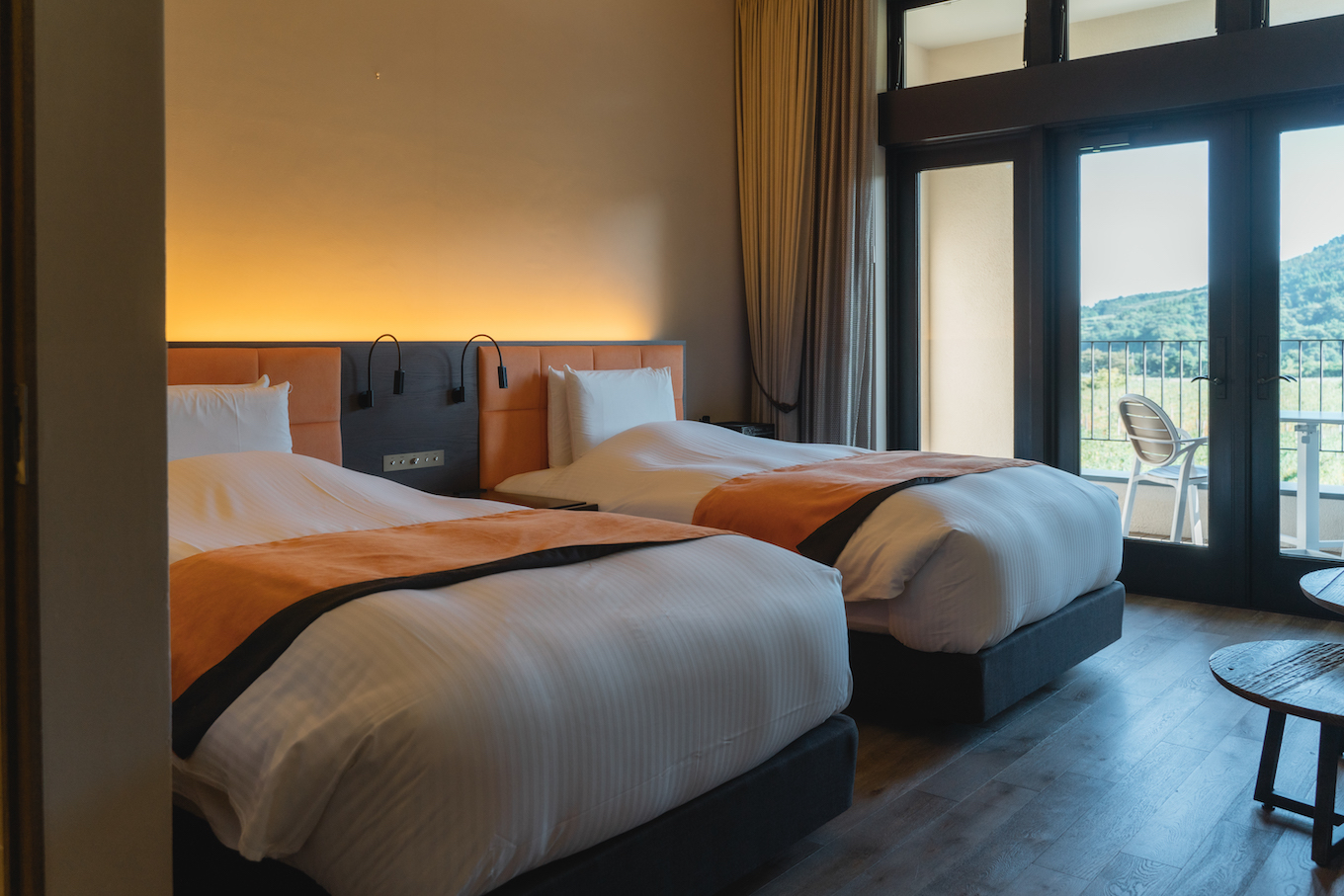 見晴らしの良い客室からは一面のぶどう畑とワイナリー全体が見渡せます。イエローカラーで統一されたインテリアは、「みつばち」をイメージ。各部屋でカラーリングやインテリアの種類が異なるのも、一層特別感を感じられて良いですね。オーガニックの世界ブランド〈AVEDA〉で統一されたアメニティも嬉しいポイントです。