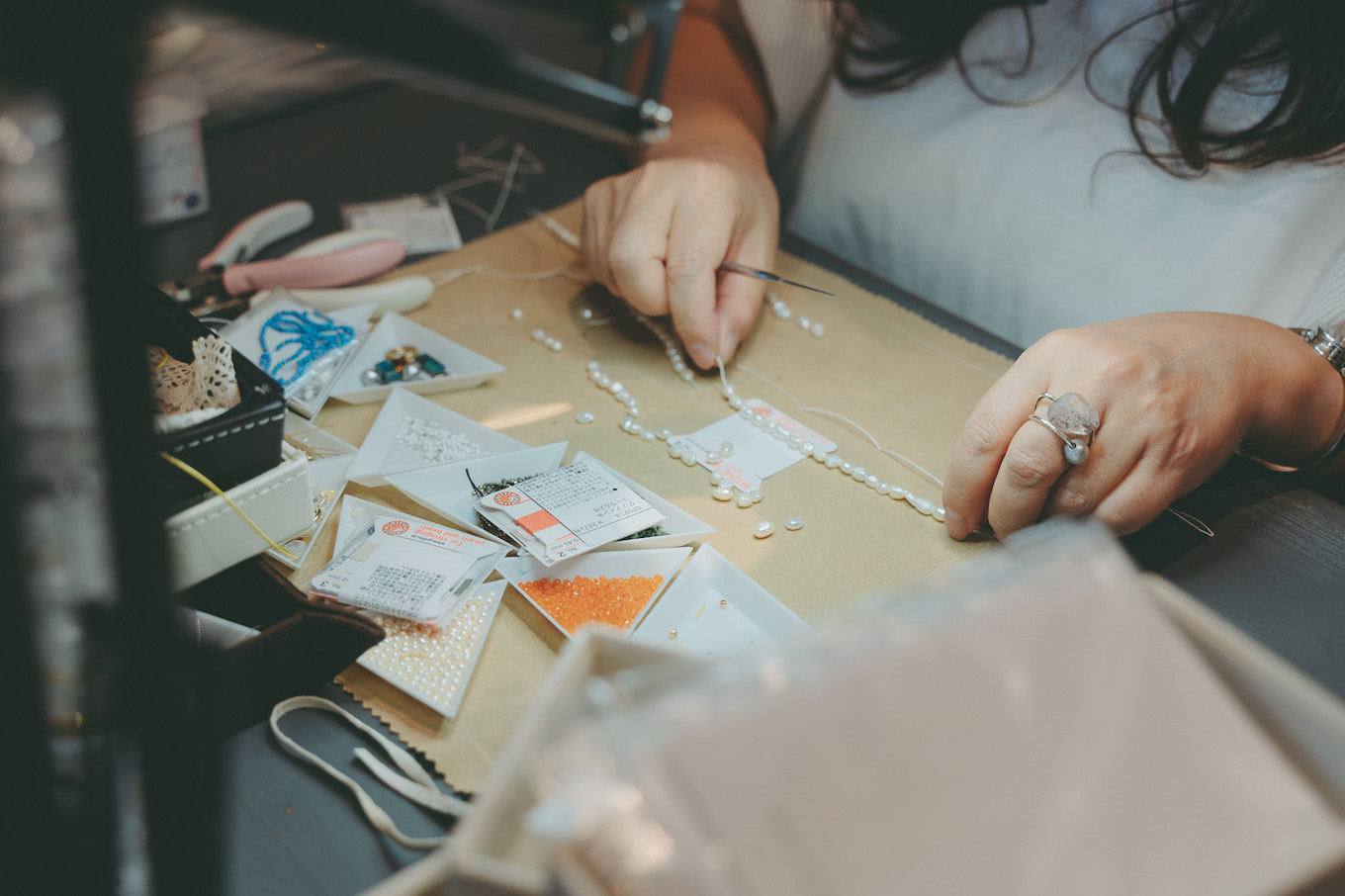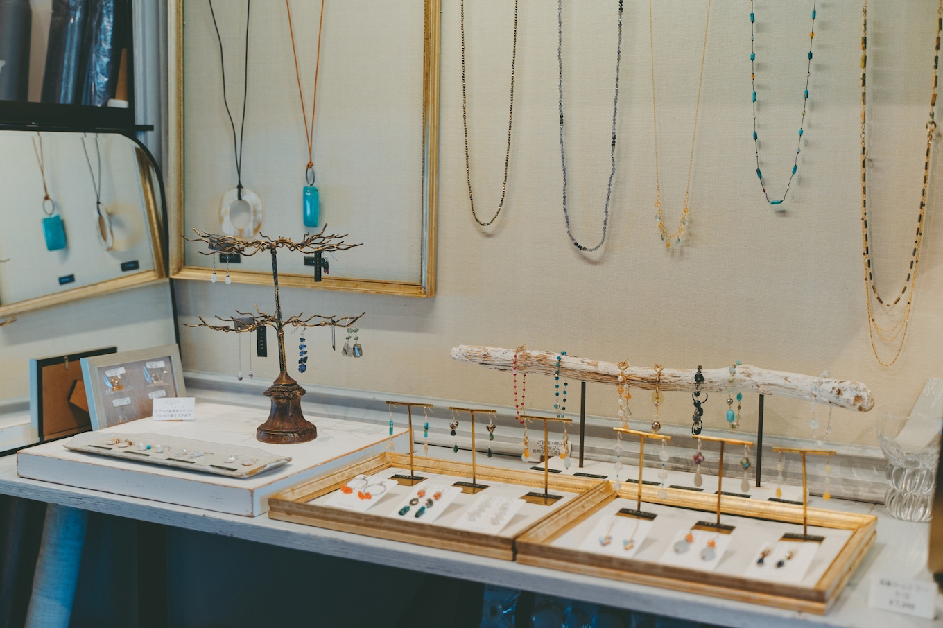 天然石をふんだんに使った手作りのアクセサリーや、ヨーロッパ各地から直輸入したお洒落な雑貨が並ぶ店内。少しずつ表情の違う石の中から、お気に入りを探すのも楽しい。店主の安立 奈緒子さん自ら手がけるアクセサリーの制作過程を見ることも。