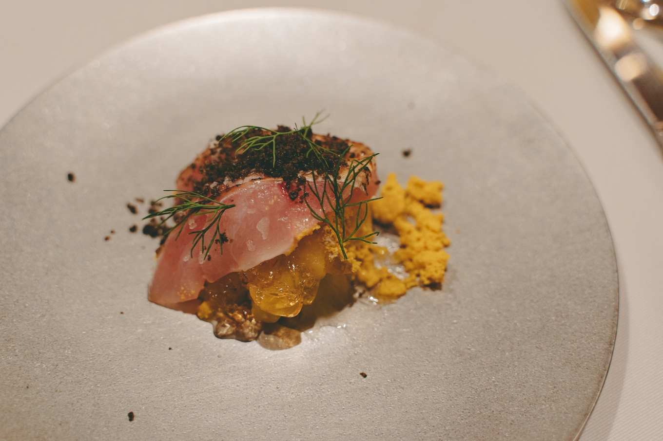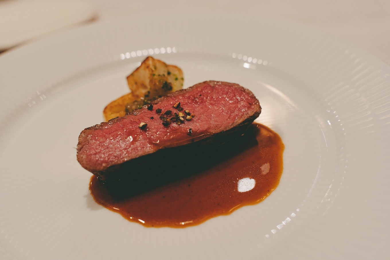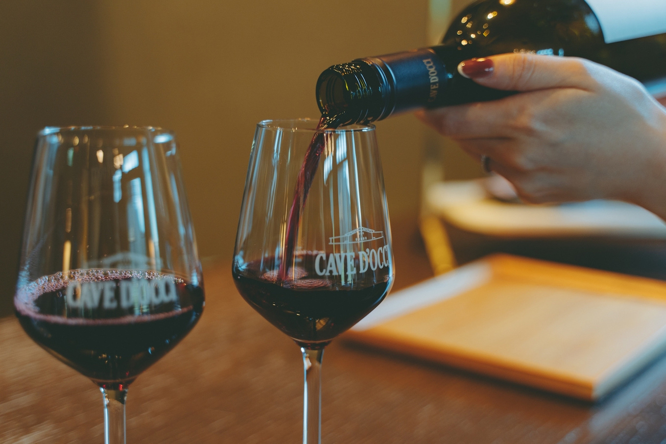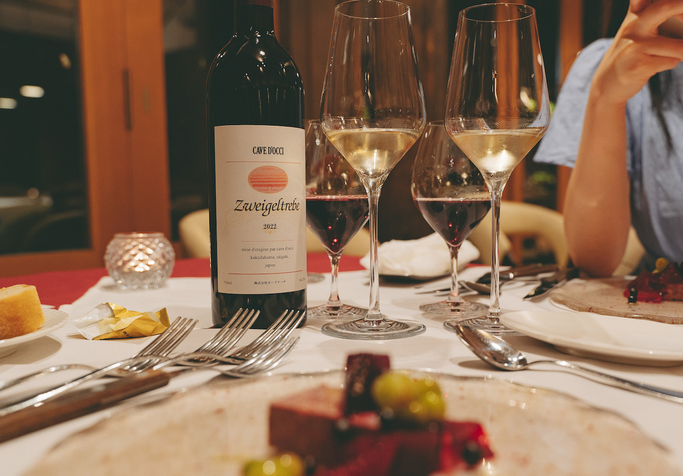 地下に熟成庫があるレストランの中でいただくディナーは、季節の食材を活かした9皿のコース。ペアリングには、カーブドッチワイナリーで作られた6種のワイン(アペリティフ除く)を楽しむことができます。ワインで作ったソースや、葡萄の枝葉を使ったお料理など、ワイナリーならではのお料理も。