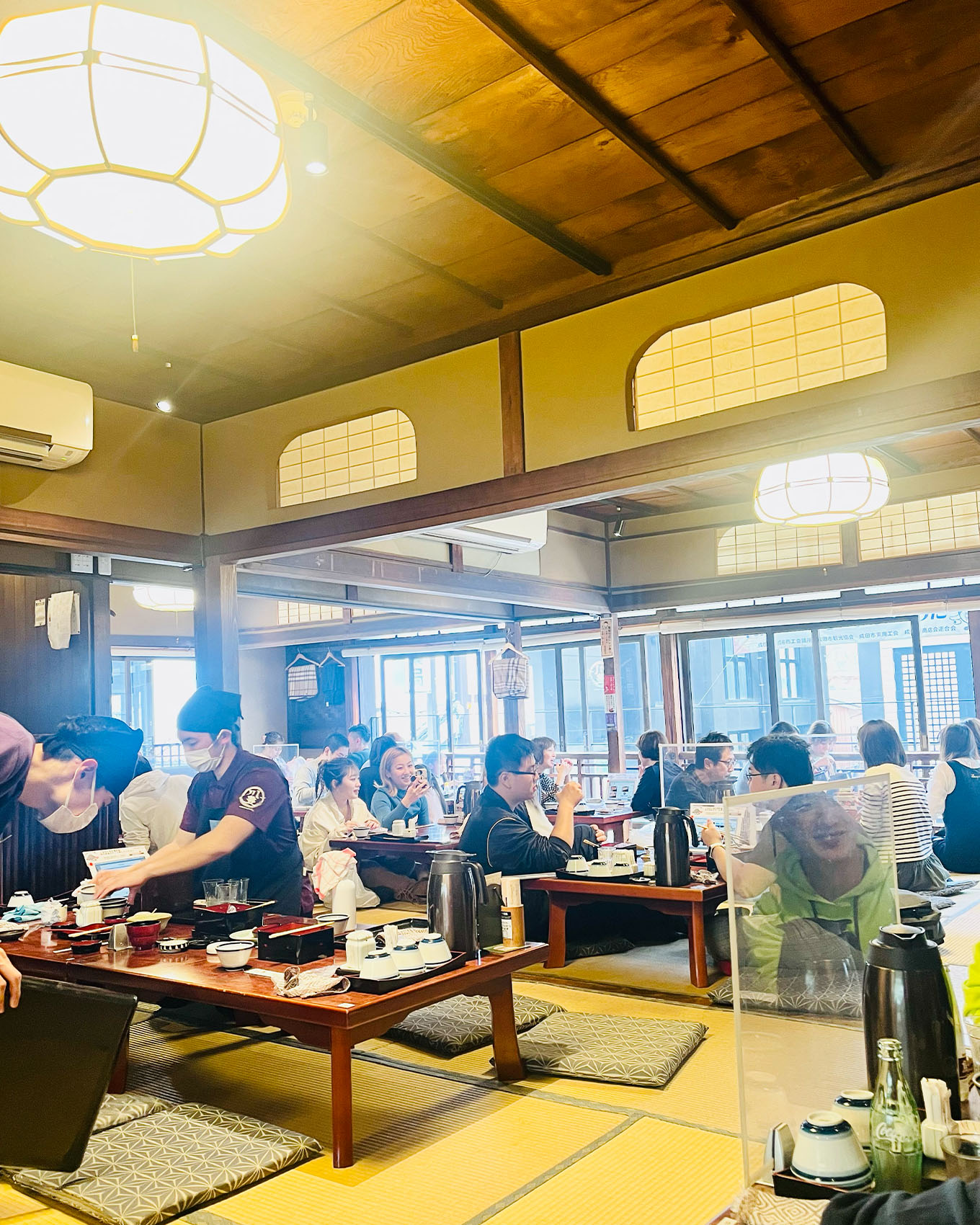 旅籠として使われていた純日本家屋は、広々と奥行きがあり、2階の大広間が賑わう様は圧巻の眺め。ちゃきちゃきと段取りよく働く店員さんの姿が心地よく、あっという間にうな重が運ばれてきます。割きたて、蒸したて、焼きたてのうなぎの艶やかさ、香りに圧倒されるでしょう。