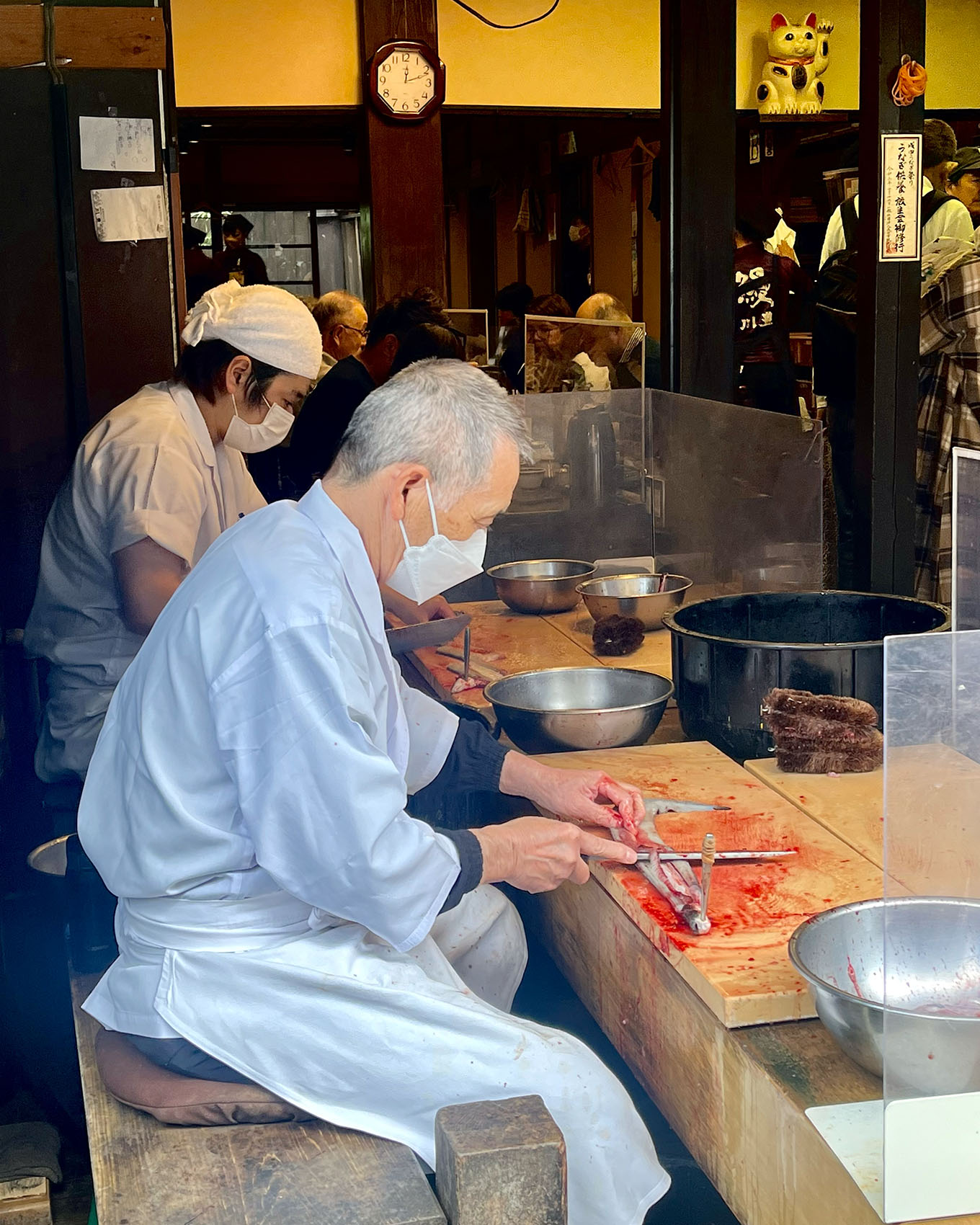 中でも一際目を引くのが、明治43年創業のうなぎ専門店『川豊』。店の前は常に人だかり、大行列。店先では熟練の職人がうなぎを捌く姿を見ることができ、活気にあふれています。