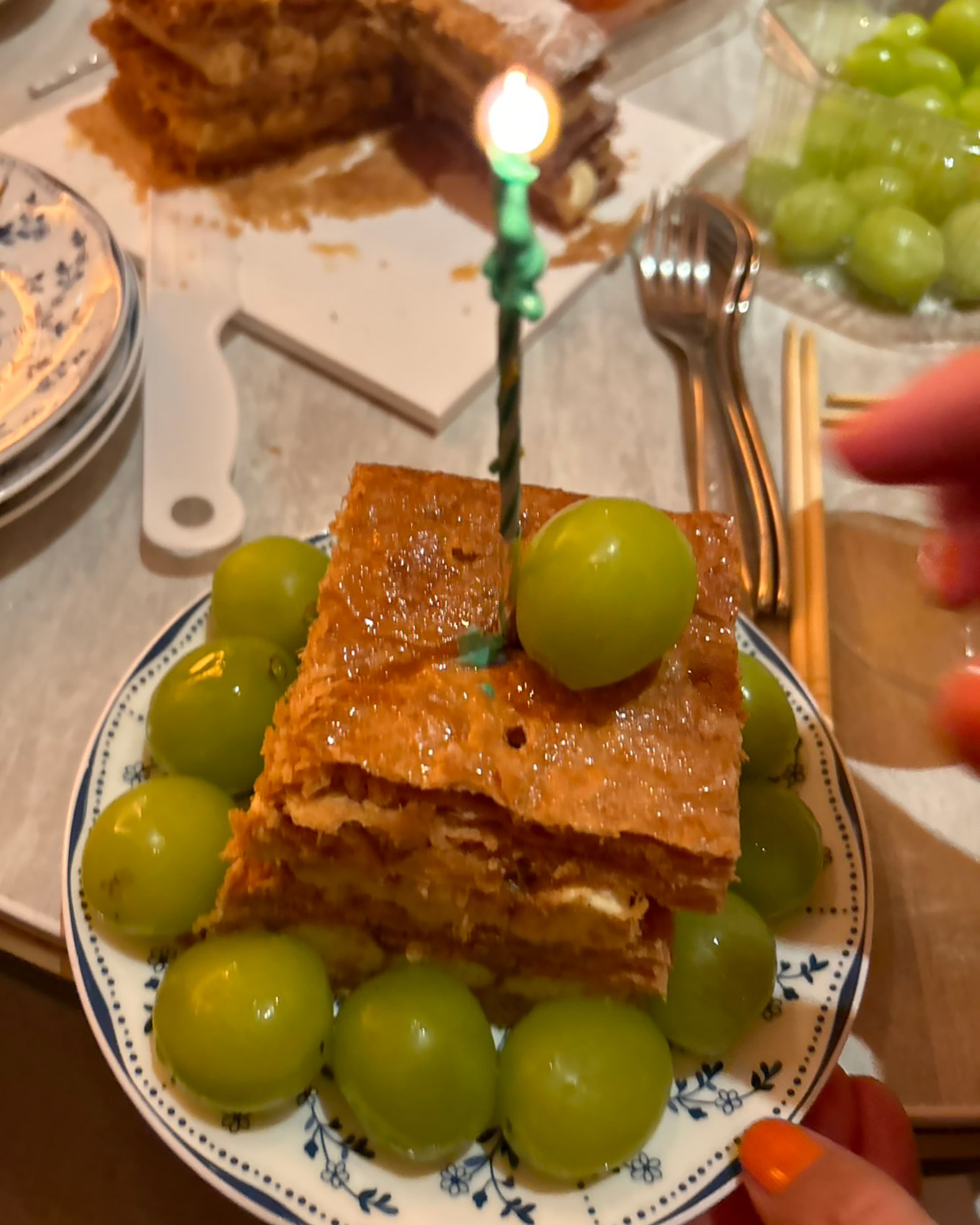 乾杯しながらおしゃべりしてると、いきなり真っ暗に。全員で行動していたのにいつケーキとプレゼントを用意してくれたのか…。