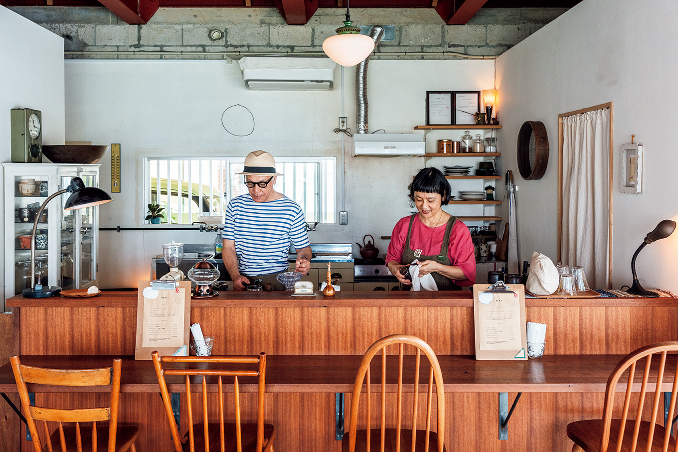 コーヒーとトーストがおいしい那覇市の小さな喫茶室『一月と八月』は、サユリさんのお気に入り。「オーナーご夫婦の人柄に惹かれ、お客さんはみなカウンターでおしゃべりしていきます」。ゆったりした店内には、2人が集めた古いランプや道具が、まるで自宅のリビングのように並ぶ。