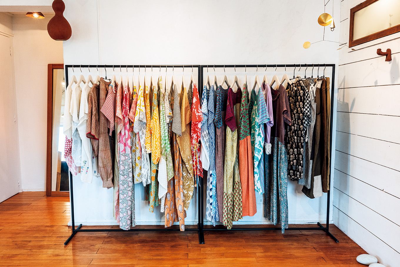 左から、大城サユリさん、新垣ロミさん、山城ミカさんの3人それぞれが、インド綿を中心に、涼しくて着ていて楽しくなる服を手作りするユニット。展示会を中心に、東京、金沢、沖縄、台湾で販売。Instagram:@3.sankaku