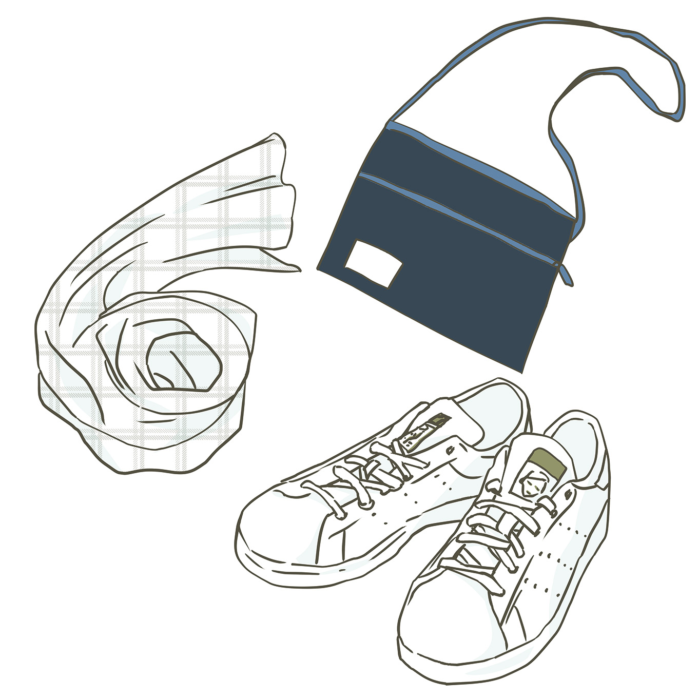 指南6/旅の三種の神器、サコッシュ、ストール、白スニーカー