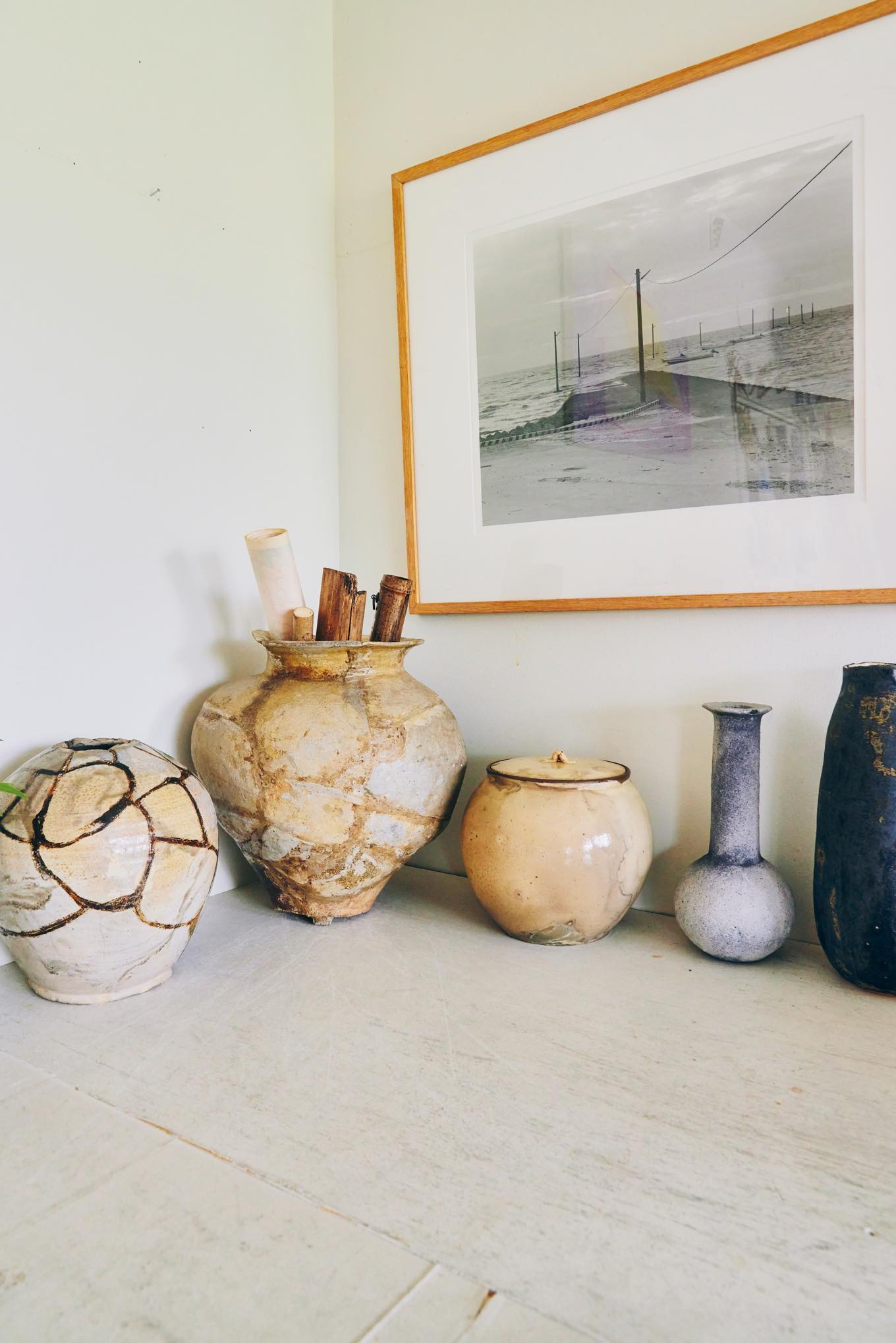 思い入れのある花器やアートを並べたアトリエの一角。左端の花器は、一緒に展示会を開催したこともある金継ぎ師・黒田雪子さんの作品。